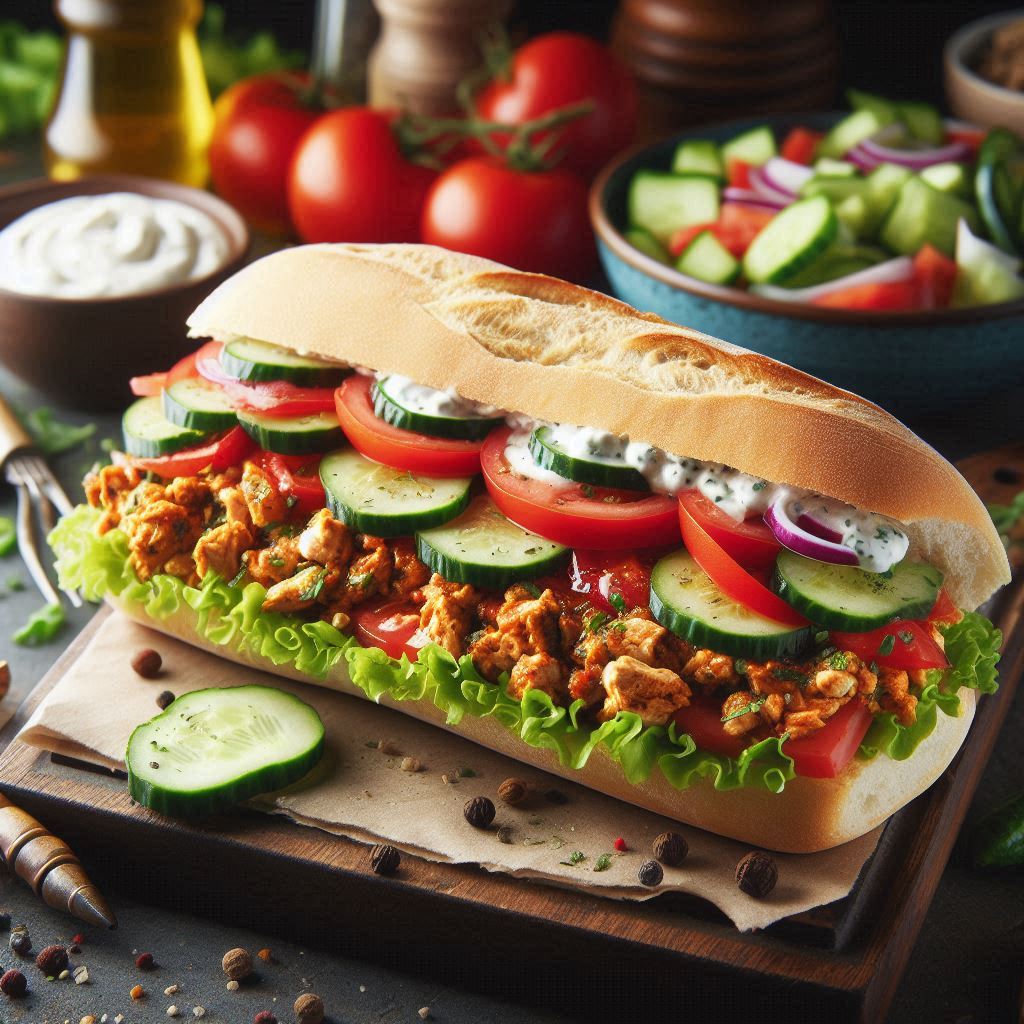 Pain baguette, Poulet émincé aux épices, Tomates, Concombres, Salade, Sauce Tzaiziki.
